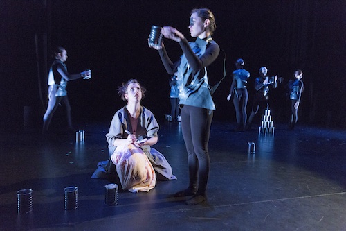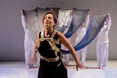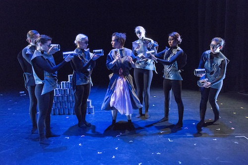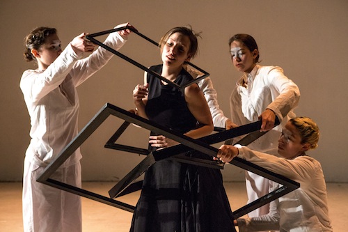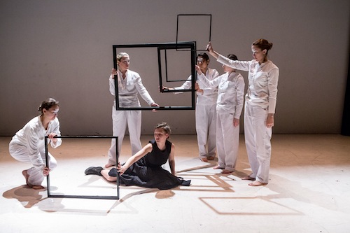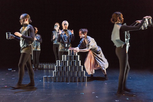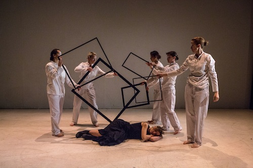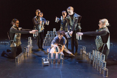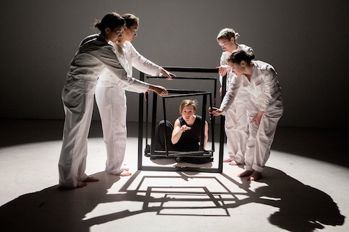 Featuring a lone human performer against a tide of geometric performing objects and a chorus of indifferent puppeteers.